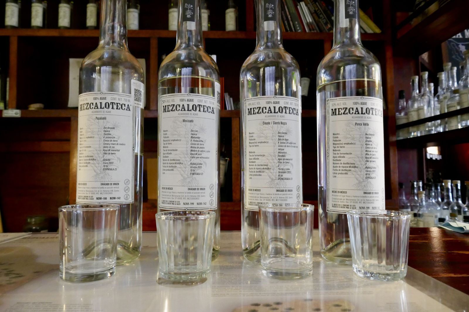 Mezcals at Mezcaloteca, with the maker, the state, the community, the agave, the type of oven, the way it was crushed... and everything else you'd like to know on the label.