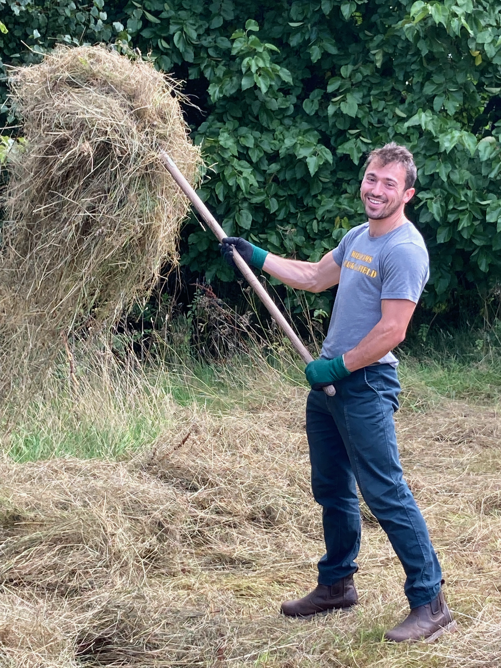 The grass was cut and the sun was shining until it wasn't, at which point it started to rain for the next few days. Me, the world's worst weatherman, stayed silent. Jeremy has a tractor attachment which spins over the wet hay and fluffs it to aid in the drying. I'm not sure if I was actually needed, but twice per day I got to follow along and turn the big piles it made. I was again handed the large metal pitchfork which, again, being biologically conditioned to enjoy, I got immense pleasure out of. Laurie Lee wrote about holding hay as, "a whole summer embalmed in our arms". A season's worth of sunshine in a light fluffy package. If I wasn't having so much fun with my metal fork it would have been nice to think about that.