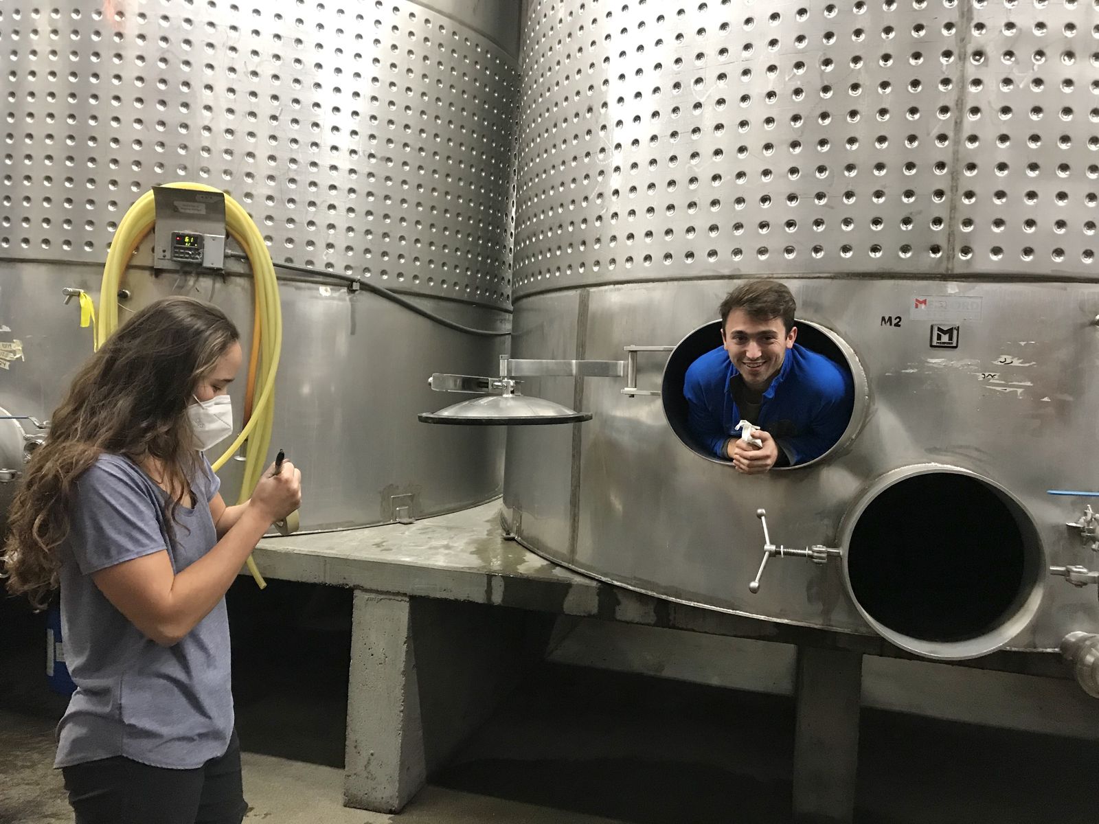 Working at a winery, despite how posh it sounds, is a lot like working in a warehouse where all the products are liquid and you're always wet or sticky. You lift things up and put them down, connect tubes to other tubes, climb ladders and smell things, move liquids from one tank to another tank, squeegee liquids to gutters, fill trash bins with liquids, make cold liquids hot, make hot liquids cold, empty barrels, fill barrels, roll barrels, lift barrels, climb barrels, sniff barrels, taste barrels, and, best of all, drink too-sweet, unfinished wine straight from the stainless-steel-teat at 11am if you so desire. Early each morning we would walk the vineyard plots, row by row, collecting samples which we'd test back in the winery. My job was to run these tests, start and monitor the fermentations of the wine wines, and fill in wherever else Stephanie told me to go. Stephanie made me the lab-worker because of my fancy stem degree. I never took college chemistry, but the lab is the only place where you look productive sitting (a luxury), so I never brought this up to Stephanie.