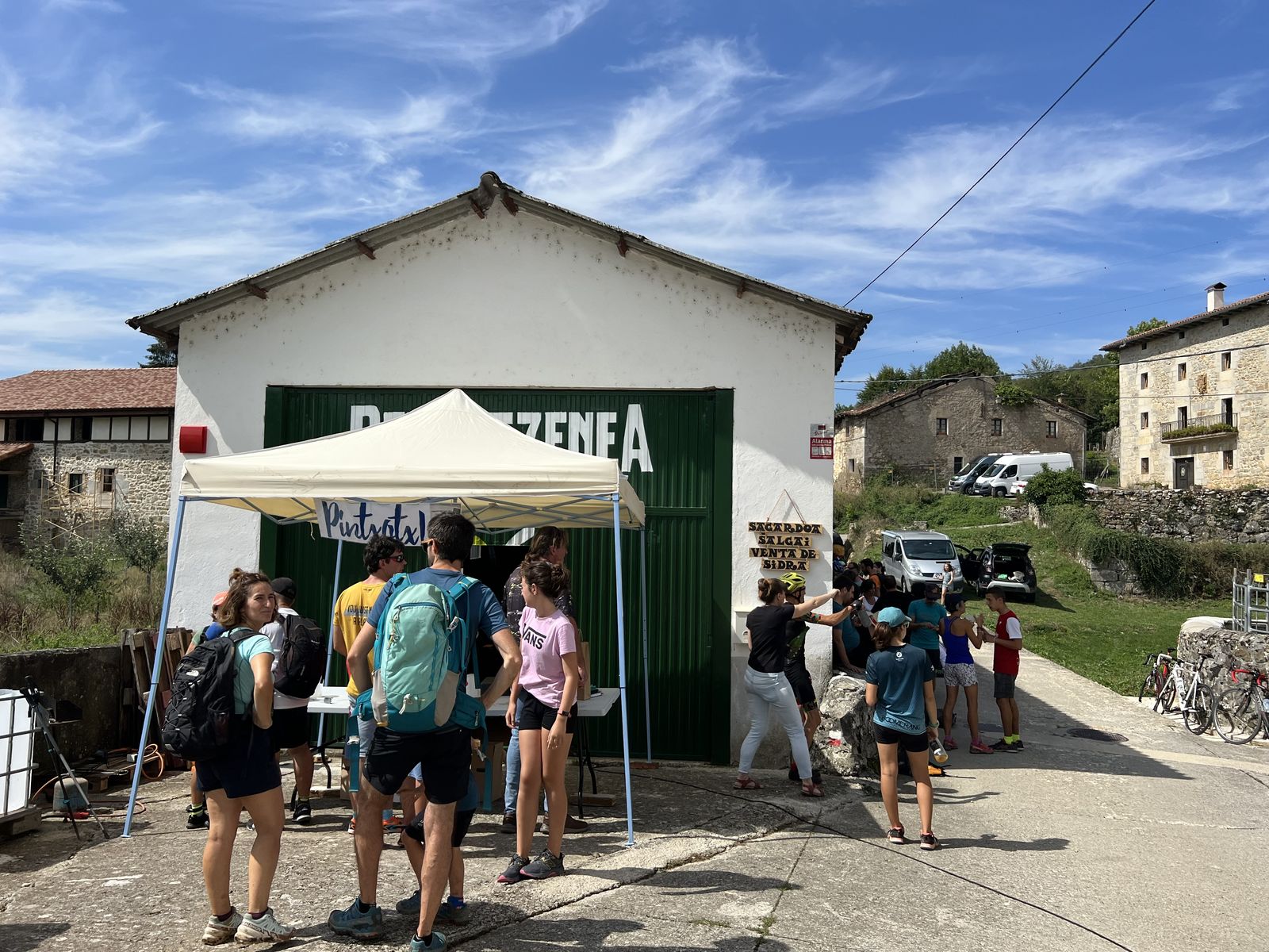 Fueled by an egg tortilla and an espresso I began my run to the top of the climb. I pass by camper vans parked on the roadside with flags and signs from all over Europe with their lawn chairs, grills, and coolers all set up. Along the route are two progressively smaller towns with fans setting up around the stoney churches and singular town bar. Shortly after the top of the climb there's the smallest village yet, with 15 weathered buildings, all of which give the impression they could double as barns or armories. I can't call it hamlet because one of the 15 buildings was, you guessed it, a church. On this day, the village was packed with cyclists and weary fans who had also made the trek. All were gathered in the small square of shade produced by a building with the words, "Sagardoa Salgai, Venta de Sidra", scrawled in a blocky, stonelike typeface. Cider for Sale in Basque and Spanish.