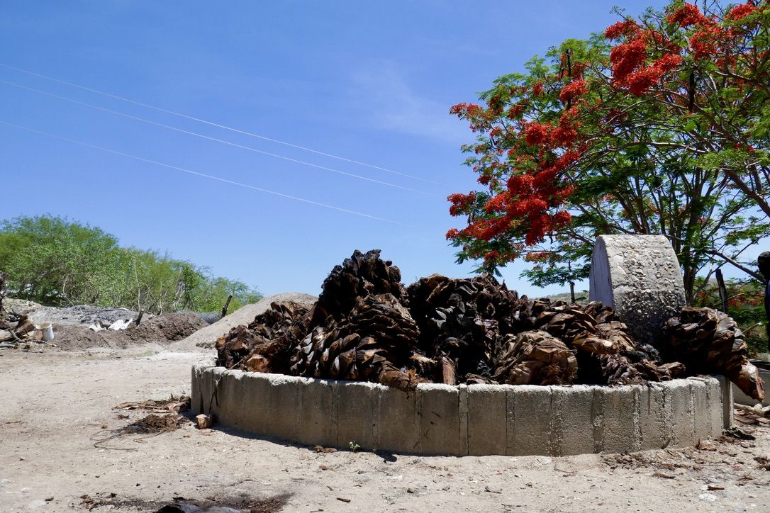 The pretty scene from the palenque, with cooked agaves in the crushing area
